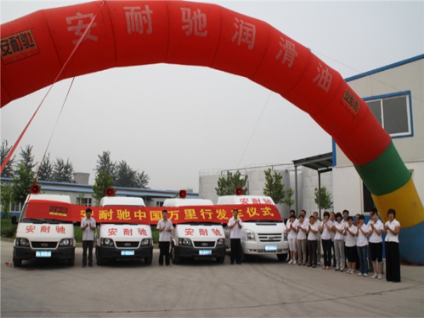 安耐驰中国万里行启动发车仪式在石家庄永隆兴经贸有限公司总部进行。上午8:30分发车仪式现场锣鼓喧天,拱门上写着“安耐驰润滑油中国万里行发车仪式”,整装待发的四辆宣传车并列停放,公司员工列队鼓掌欢送即将出发的车队和公司营销团队的队员们。公司总经理付永红先生发表了壮行词,讲述这次活动的意义、目的,预祝这次万里行活动取得圆满成功。9:00点整四辆车依次驶出公司大门,此时鞭炮齐鸣,欢送万里行车队出发。