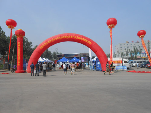 现场入口架起红色拱门、上空气球迎风摇曳、鞭炮声此起彼伏,喜庆热闹的气氛感染了周围来往的人群,吸引了当地大批卡车司机前来参与。