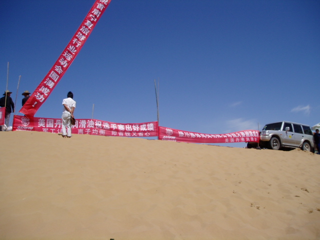 主办单位:银川市建设运动休闲城市领导小组、银川市旅游局 银川晋源汽车服务有限公司、 车之娱汽车俱乐部、 人车生活户外越野俱乐部、 宁夏大漠先锋汽车俱乐部、 中国云翔汽车俱乐部、 银川丁丁车工厂、 银川极限金邦汽车改装俱乐部、 灵武市风速汽车越野俱乐部、 灵武市摩托车俱乐部、 飚骑越野俱乐部 、 飚风越野摩托车运动俱乐部、 摩之旅俱乐部、 胜途摩托车俱乐部、 贺兰山车队 猎豹迷你机车俱乐部 正值绚烂六月,2009年银川市沙漠运动休闲系列活动暨首届宁夏旅游行业运动会沙漠项目各类比赛在黄沙古渡景区隆重开幕。 沙漠机车冲坡大赛,这次吸引了宁夏及周边十六支队伍参加本次大塞,我们银川德锋商贸有限公司携丹弗润滑油赞助了本次机车冲坡大赛。在比赛场地显眼的位置我们搭建了丹弗润滑油展架及写真喷绘条幅等,进行大力宣传。。比赛场地前围观了很多观众,不少观众在展台前驻足停留,了解丹弗润滑油。这次比赛还吸引了宁夏各大媒体的宣传报道,取得了很好的宣传效果。伴随着轰隆隆的机车声,机车向20多米长近90度的抖坡上冲去,机车冲破的惊险和刺激,赢得了游客们的阵阵喝彩。