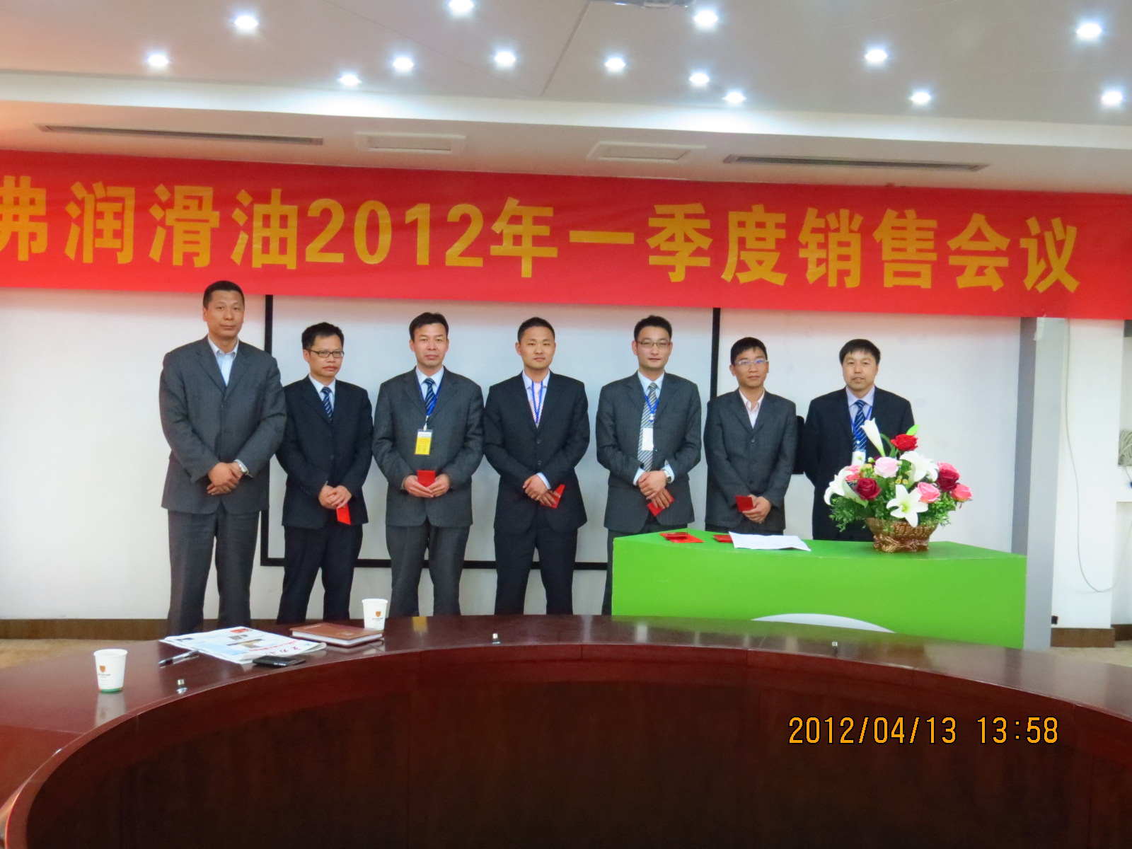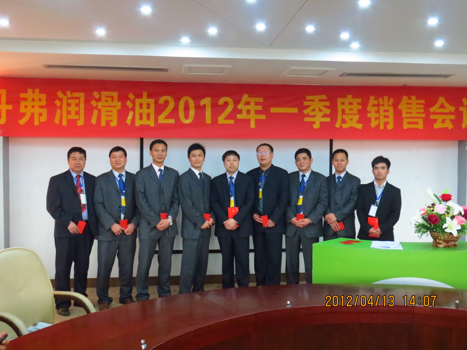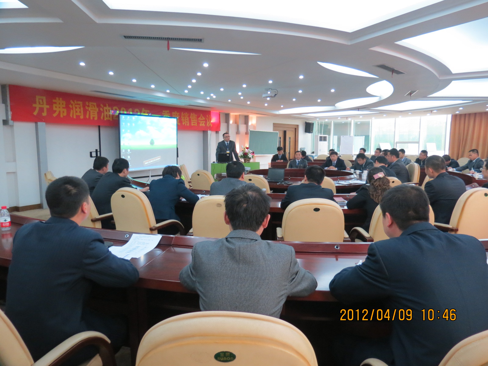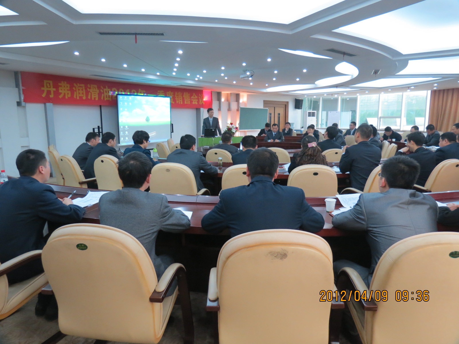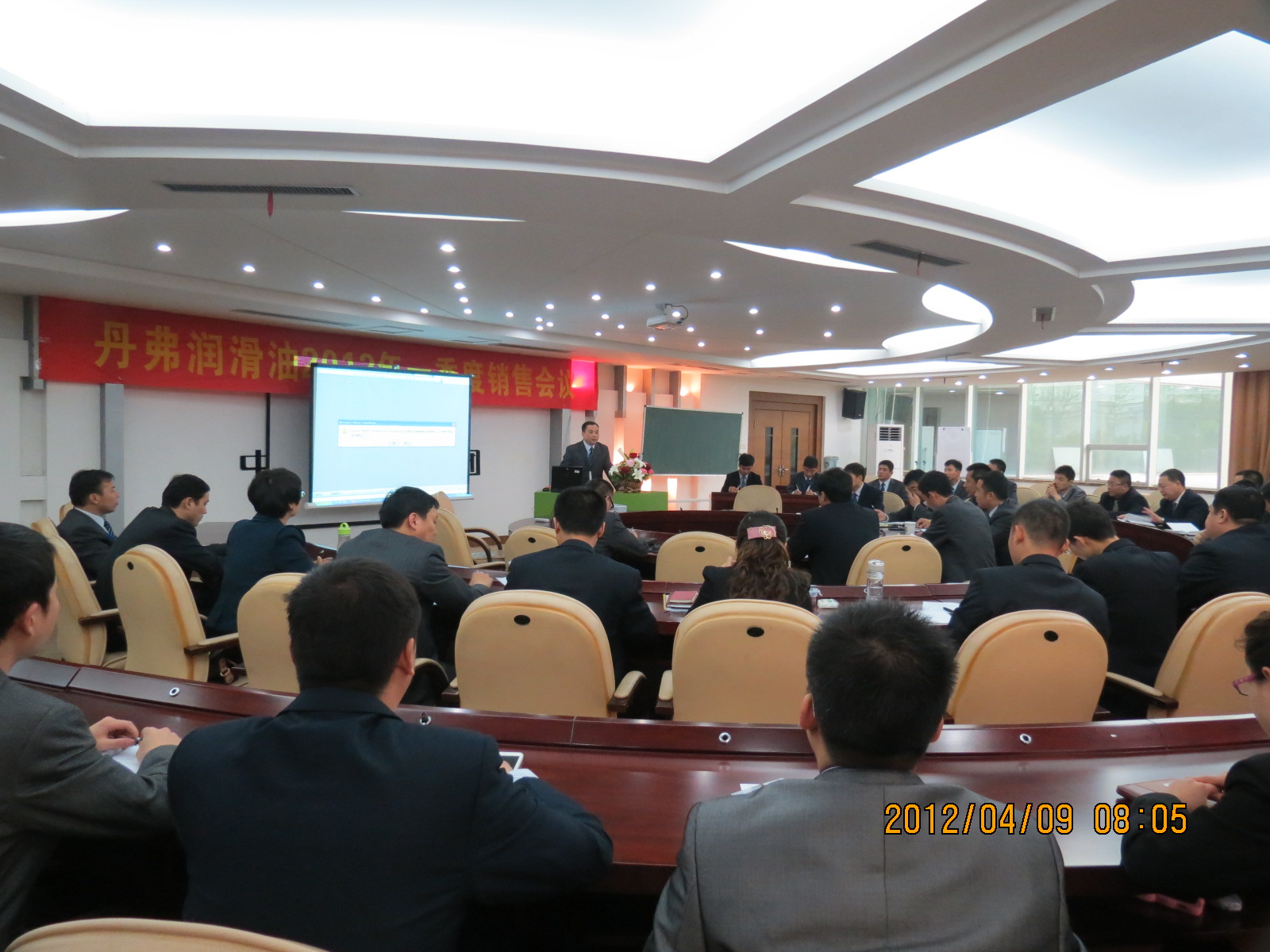 丹弗润滑油2012年第一季度销售会议在集团本部二楼会议室召开。本次会议历时六天,会议由李建东经理主持,本次会议事项主要进行了如下事项: 1、 季度各区域销售汇报 2、 季度各大区、出租车部、工业油部销售总结 3、 销售部王伟总监、车用油孔歆经理分别汇报了公司季度的整体销售情况,本季度销售业务圆满完成并超额目标任务30% 4、 生产部、财务部、广告部、行政部、采购部等部门负责人进行了工作述职,对本部门运作情况进行了汇报。 5、 公司王安文总经理对本季度公司各部门运作情况进行了说明,对公司本季度取得的骄人业绩表示满意,并对丹弗润滑油厂区扩建项目情况进行了阐述,对今后生产经营能力,品牌运营方向,企业发展蓝图等战略发展目标进行了详细描绘; 6、 会议对本季度取得的优胜区域和大区进行了表彰,未位淘汰制如期实施。会上对先进和需鼓励、未位的进行上榜公示,本项销售措施的实施对销售人员有极大的触动,更需全力争取,发挥自身优势。 7、 东大区宋永丰经理主持了专业知识及销售技巧的培训 8、 集团执行总裁张涛对全司人员进行了商务礼仪培训 9、 各大区分组讨论,并对下一季的工作进行了明细要求。 10、 公司所有人员学习了《执行智慧视频教程》 11、 市场问题解答 12、 会后公司组织了户外拓展、攀跃盘龙谷、野外烧烤活动 本次会议圆满成功,取得了预期的效果,通过培训、拓展销售人员的整体积极性、商务知识等得以大幅提升。