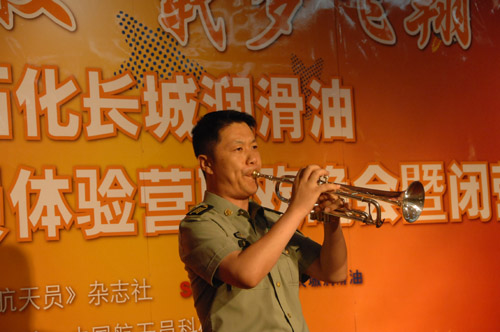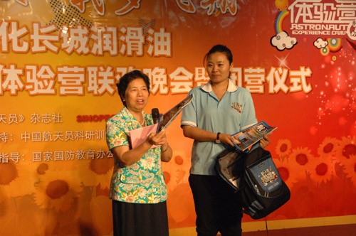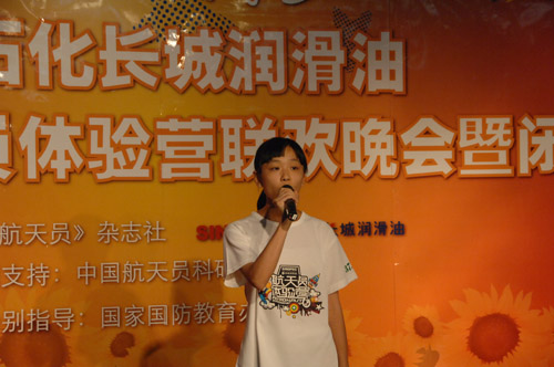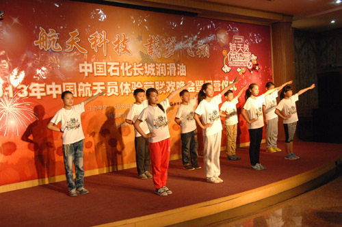 7月14日晚,为期三天的中国石化长城润滑油“2013年中国航天员体验营”活动在北京航天城举行联欢晚会暨闭营仪式。航天英雄杨利伟、景海鹏、刘旺、刘洋和体验营辅导员孙锦云将军来到晚会现场,与营员们一起携手联欢。中国石化集团公司思想政治部主任吕大鹏、中国石化润滑油公司总经理宋云昌、中国石化润滑油公司党委副书记苟连杰出席晚会。 晚会上,小营员们自编自导的各类节目,展示了自己在体验营活动中取得的进步,表达了对航天英雄和航天城教官的感谢,精彩的演出也为体验营活动画上了一个圆满的句号。