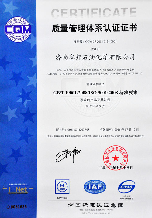 近日,济南赛邦石油化学有限公司顺利通过了ISO 9001:2008质量管理体系的复评认证,赛邦石化早在2002年就初次通过了ISO 9001:2008质量管理体系的认证,坚持年审和复评,真正用ISO 9001:2008质量管理体系来管理企业,把控质量并持续改进,从根本上稳定了产品质量。
