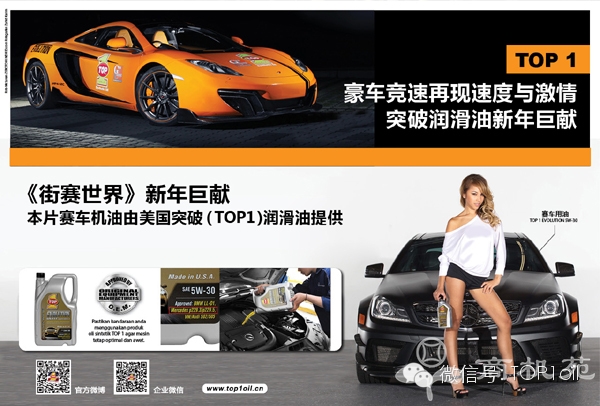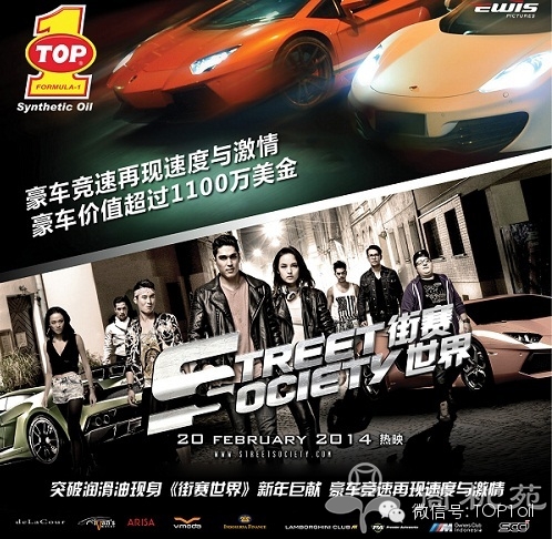 由世界三大竞技机油品牌突破(TOP1)润滑油赞助的新年巨献赛车影片《街赛世界》(Street Society)将于2014年2月20日在亚洲首映。突破(TOP1)润滑油在此部电影中也扮演了重要角色,片中的豪华赛车使用的是突破(TOP1)合成机油。 ![]() 这是一部充满冒险、刺激的汽车动作片,耗资1500万美金,将有30多种进口超级豪华车参与此部电影,如兰博基尼、梅赛德斯奔驰、迈凯轮、保时捷、法拉利、宝马、宾利、阿斯顿马丁等豪车将悉数亮相。这些跑车不仅配备了劲爆的马力(315马力至616马力),车辆总价值也令人震惊,高达1150万美金。