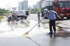 图为城管队员和环卫员工正在清洗油泼地面 昨天上午10时多,一辆满载润滑油的货车途经329国道镇海骆驼段一个弯道时,高温暴晒下桶壁变软,承受不住重量,4桶润滑油一下子爆裂,泼撒到马路上。一名路过女士因路...