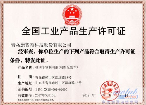 5月底,康普顿制动液产品取得由山东省质量技术监督局颁发的新的《全国工业产品生产许可证》。