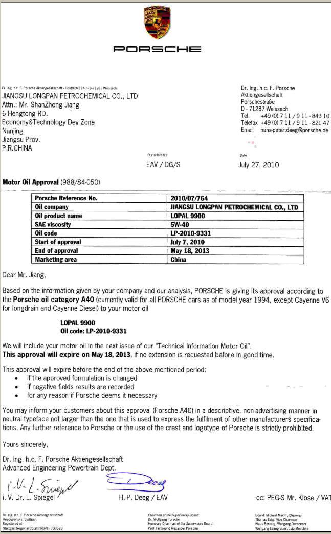8月24日,我公司正式接获德国保时捷公司发来的通知及认证证书,宣布龙蟠净威汽机油产品(送检样品批号为LOPAL 9900)已经正式通过保时捷公司的A40认证(保时捷针对机油产品的专项认证),证明该产品可广泛应用于911系列、Boxster系列、Cayman系列等保时捷公司的各类高档赛车。