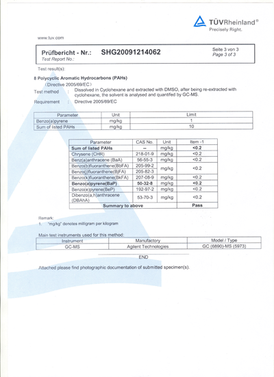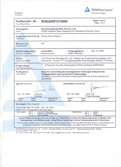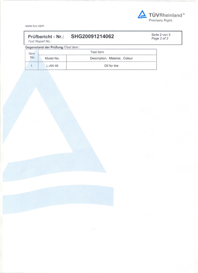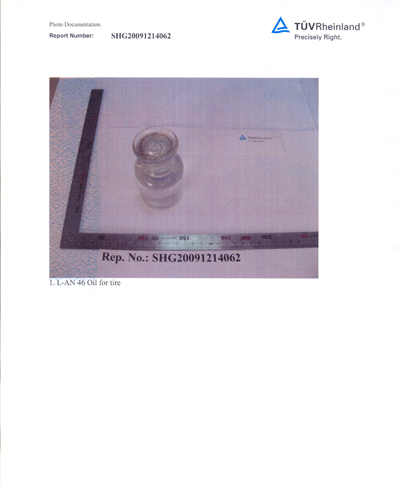 山东源根石油化工有限公司从2008年初,就致力于该类产品的研究和开发,到2009年底已形成了稳定可靠的生产技术和工艺,通过对基础油的特殊脱毒处理,研制出了质量达标的生产出口橡胶制品、橡塑制品及尼龙件制品等使用的46#AN机械油。该油的Benzo(a)Pyrene检测结果为<0.2mg/kg(标准为少于1mg/kg),而PAHS的检测结果为<0.2mg/kg(标准为少于10mg/kg),我公司研发的这类橡胶制品专用机械油现已顺利通过欧盟认可检测。其具体检验报告如下:
