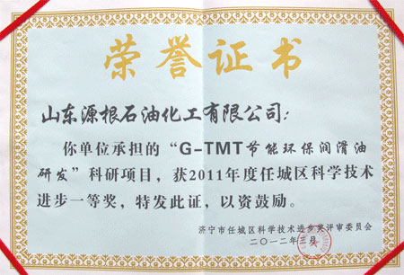 2012年3月28日上午,济宁任城区政府为充分调动广大科技工作者开展科技研发的积极性,鼓励科技创新,加速成果转化,推动我区经济社会科学发展跨越发展,现决定对28项重要科技成果授予济宁市任城区科学技术进步奖,其中公司承担的“G-TMT节能环保润滑油研发”科研项目,荣获2011年度任城区科学技术进步一等奖。 公司将在今后的工作中,进一步认真贯彻区委、区政府提出的“科教兴区”战略,积极投身经济建设主战场,发扬不断创新、锐意进取、团结协作、勇攀高峰的精神,加强科学技术的研发与开发,加速科技成果转化,不断为我区经济科学发展跨越发展做出新的更大的贡献。