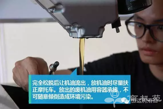 3、放出的机油要妥善处理并处理 在放油的时候摩托车下面最好准备容器承接废润滑油,废润滑油对土壤和环境有较为严重的影响,遗撒在道路上会造成交通事故,因此废润滑油一定要妥善处理,可以交给维修店回收。由于演示用的是新润滑油,所有放出润滑油很鲜亮,而机油发黑并不代表润滑油失效,具有优秀清散能力的润滑油加入发动机后就会吸附内部污物而变黑,因此润滑油变黑并不能表明润滑油需要更换。