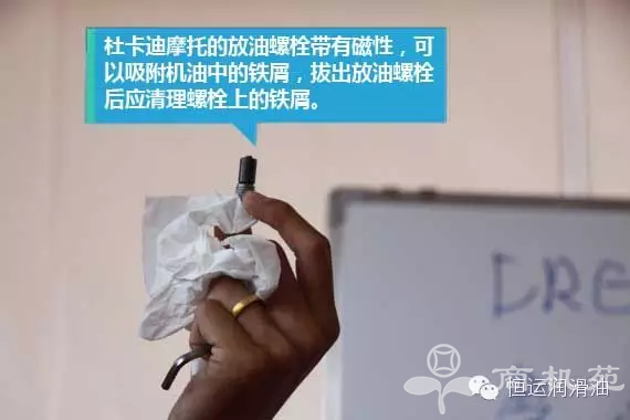 4、放油螺栓有吸附铁屑的磁铁 ![]() 杜卡迪摩托车的放油螺栓上装有磁铁,可以吸附润滑油内的铁屑,在装回放油螺栓之前要对放油螺栓进行清洁,清除铁屑。