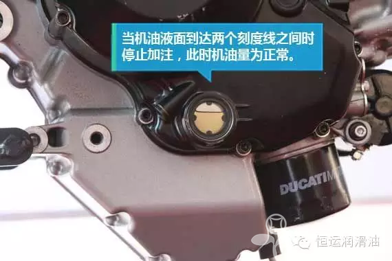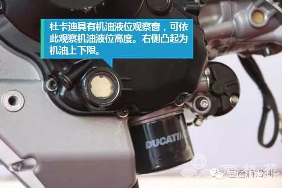 9、关注液位观察窗 ![]() 在加注润滑油前应熟悉车辆的机油用量,一般说明书上会有标注。杜卡迪因为具有机油液位观察窗所以确认润滑油量很方便,需要注意的是润滑油窗在车辆直立放置时才是正确液位。