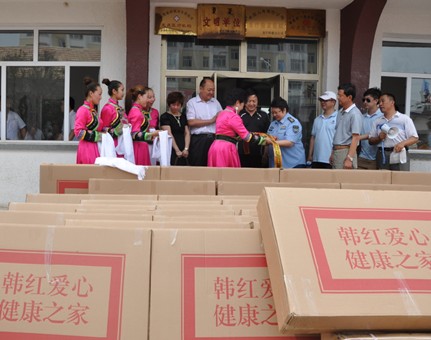 2012年7月7日是韩红爱心百人援蒙的第一天,早晨8点半援蒙团队启程爱心活动第一站—桥头镇。韩红先携领部分爱心车辆前往赤峰儿童福利院捐赠脑瘫患儿康复器材。而另外一组队伍——医疗组则前往翁牛特旗桥头镇中心卫生院义诊。