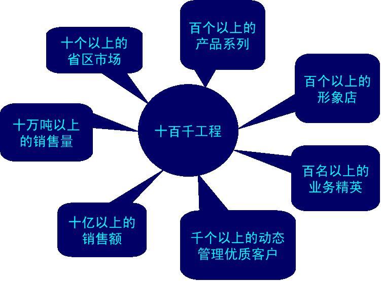 如发展:10个以上省区级市场、10万吨以上销售量、10亿以上销售客;团队上发展100名以上营销精英;100个以上东风油品的形象店;产品系列争取上马100个系列以上;客户发展上实现1000个以上的动态管理优质客户。