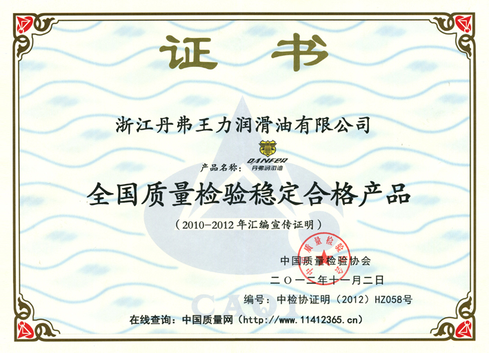 近日,我公司收到中国质量检验协会通知,自2010-2012年期间近三年的产品质量监督抽查中及2010年前的检查记录中,浙江丹弗王力润滑油有限公司生产的产品无任何不合格记录, 经研究决定授予公司生产的产品为"全国质量检验稳定合格产品"并颁发证书。可登录中国质量网www.11412365.cn进行查询。