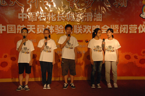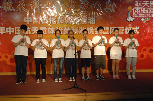 7月14日晚,为期三天的中国石化长城润滑油“2013年中国航天员体验营”活动在北京航天城举行联欢晚会暨闭营仪式。航天英雄杨利伟、景海鹏、刘旺、刘洋和体验营辅导员孙锦云将军来到晚会现场,与营员们一起携手联欢。中国石化集团公司思想政治部主任吕大鹏、中国石化润滑油公司总经理宋云昌、中国石化润滑油公司党委副书记苟连杰出席晚会。 晚会上,小营员们自编自导的各类节目,展示了自己在体验营活动中取得的进步,表达了对航天英雄和航天城教官的感谢,精彩的演出也为体验营活动画上了一个圆满的句号。