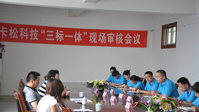2013年7月21日,卡松科技ISO9001质量管理体系、ISO14000环境管理体系和OHSAS18000职业健康与安全管理体系“三标一体”认证审核末次会议召开。公司总经理陆世胜、副总经理胡轩、孙咏吉、王凤玲及各部门负责人出席了此次会议。 审核小组总结陈述中宣布:经过严格而细致的审核及评定,审核组一致认为卡松科技有限公司的“三标一体”管理体系运行良好,因此予以通过现场审核。