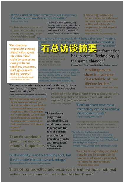 5、积极为员工举行各类培训 2013年,公司为提高员工的综合素质,拓宽员工的视野,积极组织了各类培训活动。从公司的企业文化到各部门的相关技能培训,及行业知识培训和安全知识培训等。销售精英培训和内部讲师培训已经成为公司的经典培训活动,有效提高了员工的工作业务能力和综合素质。 ▲龙蟠石化在遵守劳工原则上的未来展望 龙蟠石化始终将员工待遇提升置于与企业发展同等重要地位,今后将一如既往地遵守坚决执行国际劳工组织关于劳工标准的核心公约以及其他国际条约,严格执行全球契约关于劳工标准的原则,并结合国内及企业自身情况,持续提升员工的工作环境与薪酬待遇。同时,还将继续创新用工制度,提升员工满意度和幸福度。 三、环境原则 原则7:企业界应支持采用预防性方法应付环境挑战 原则8:采取主动行动促进在环境方面更负责任的做法 原则9:鼓励开发和推广环境友好型技术 保护环境,创建人类美好家园是每个公民义不容辞的义务,也是每个企业应该履行的社会责任。润滑油行业作为能源行业的重要组成部分,对于促进环保、节能、减排的国家发展战略目标,具有义不容辞的社会责任。在过去一年中,龙蟠积极履行可持续发展的战略步骤,把环保与节能减排作为产品研发的指导重点。 过去一年来龙蟠石化在环境保护方面所取得的成绩与效果: 1、积极参与全球性环境会议,为环境保护和环境治理积极献言献策。 2013年7月,龙蟠石化作为国内润滑油行业的唯一代表,出席了在北京举行的由中国企业界推动和倡导的“生态文明•美丽家园”关注气候中国峰会。并和与会企业共同签署了《中国企业界关注气候倡议书》,同时,公司代表还应全球契约组织中国网络的邀请,在当天举行的中日韩全球契约成员圆桌会议上,就企业如何应对气候变化的议题进行了主题发言,为关注中国气候积极献言献策。 7月份,龙蟠代表还出席了在中国常州举行的“2013城市公交发展模式与企业成本规制和低碳智能维修技术交流会”,为城市公交的低碳排放提出了富有成效的可行性方案。 3、在公司内部大力开展节约、环保宣传行动 公司号召员工节约从点滴做起,珍惜节约水资源,保护地球。积极践行关灯1小时活动。从每个员工的行动中,切实节约资源,减轻地球压力。 ▲龙蟠石化在环境保护方面的未来展望 龙蟠石化将严格遵守全球契约关于环境保护的原则,积极响应联合国及中国政府关于环境保护的各项政策与呼吁,为促进全球经济与社会的可持续发展贡献自身的力量。在未来,将继续加大投入,积极研发出新的环保技术和环保产品,为建设美好人居环境做出应有的贡献。 四、反腐败 原则10:企业界应努力反对一切形式的腐败,包括敲诈和贿赂 诚信经营一直都是龙蟠石化内部质量管理体系的极为重要的组成部分,龙蟠石化自成立以来,一直严格遵循关于商业诚信经营的相关全球标准,并持续不断地向我们的员工、供应商及客户传达龙蟠的价值观和诚信原则。 龙蟠石化在反腐败原则方面所作出的努力 过去这一年,我们进一步完善了反腐败及商业经营诚信方面的规章制度,并且强化了相关财务费用支出的内部审计工作,不断加大防治力度,预防各类职务犯罪及侵害公司利益的违法行为,为公司的持续快速健康发展营造廉洁健康的内部环境,并定期召开培训会议,加强全体员工的反腐与诚信意识。 公司严禁任何形式的违法违规活动,抵制一切不法商业行为,如贿赂、商业欺诈、投机等。 同时,公司在过去一年中,强化了相关财务费用支出的内部审计工作,并加强供应商的审计工作,提高财务管理水平。 ▲龙蟠石化在反腐败方面行动的未来展望 龙蟠石化将坚决执行、遵循全球契约关于反腐败的原则,切实防范各类商业贿赂等员工腐败行为的发生。 结语: 在过去的这一年当中,龙蟠石化在履行全球契约十项原则方面取得了令人瞩目的成就,今年9月,龙蟠石化应邀参加了在美国纽约举行的全球契约组织领导人峰会。 图为龙蟠石化吕振亚副总经理在峰会期间与全球契约总干事乔治·科尔先生合影 同时,龙蟠的石俊峰总经理也作为全球CEO的代表之一,应邀接受了埃森哲的“2013全球CEO企业可持续发展专题访谈”。 图为埃森哲访谈报告中的石总访谈摘要