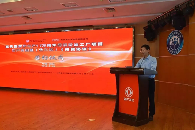 会上,东风嘉实多总经理张先龙,副总经理、党总支书记杨洁,和青山区委常委杨新,分别代表东风嘉实多和武汉市青山区(化工区)在签署了《投资协议》。